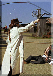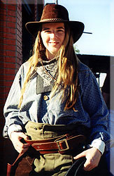 If requested, Calamity Kate can bring out her lasso and roping dummy cow head to do roping demonstrations as well as teach all the greenhorns how to rope hands-on. She can also bring along her bullwhip by request to do a variety of loud whip cracks. In addition, Kate carries a blank-firing Old West revolver that can fire loud blank loads, if requested.